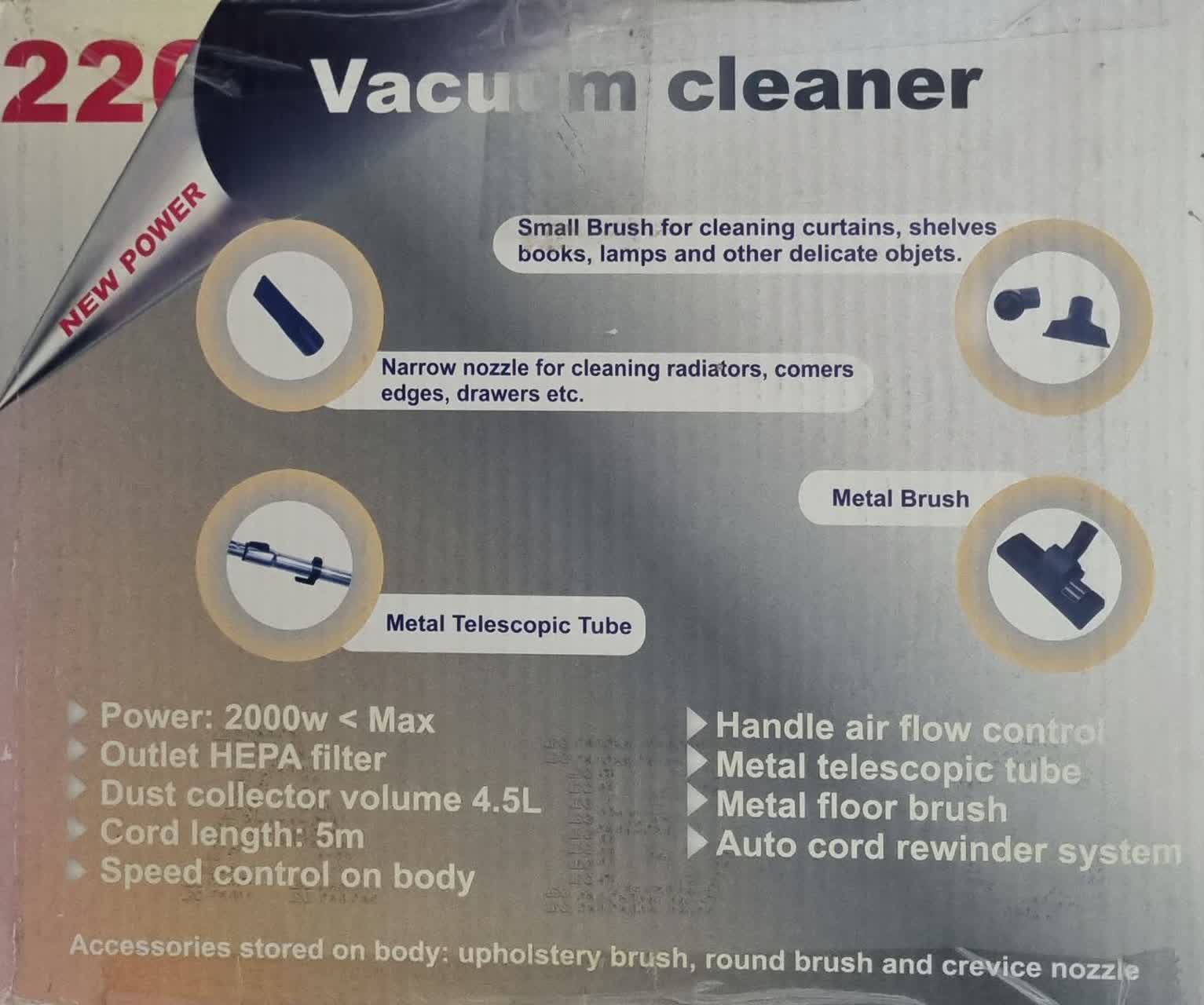 قدرت: 2000 وات < حداکثر فیلتر هپا خروجی حجم گردگیر 4.5 لیتر طول سیم: 5 متر کنترل سرعت روی بدنه کنترل جریان هوا با دسته لوله تلسکوپی فلزی برس کف فلزی سیستم جمع کننده خودکار سیم